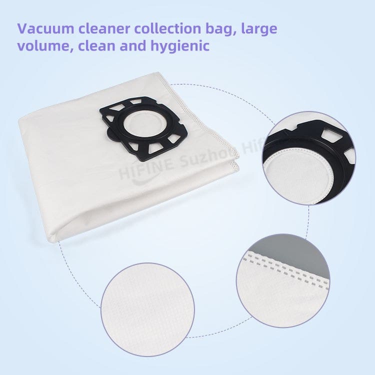 The Hifine WD4 Vacuum Cleaner Dust Bag is engineered with premium non-woven material that provides exceptional durability and filtration performance. With an H13 efficiency rating, this dust bag captures fine particles effectively, ensuring cleaner exhaust air and protecting vacuum motor components from debris. The design focuses on high permeability, maintaining optimal airflow while trapping contaminants. Customization is available to meet specific requirements, and the product comes in a standard size that fits the WD4 model perfectly. The construction emphasizes reliability and consistent performance in demanding environments.